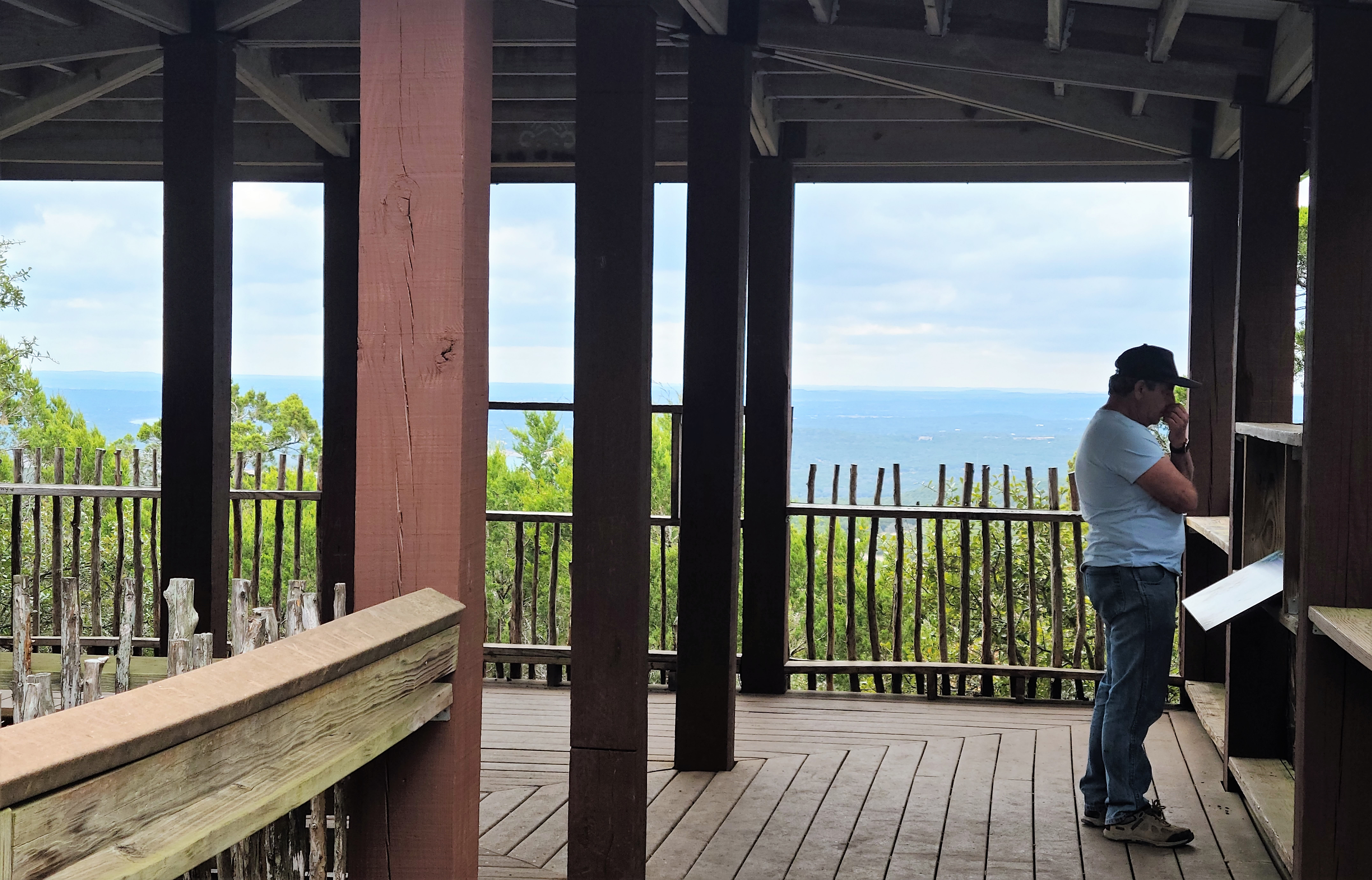 A typical day starts around 8am when we check in and get our tasks for the day/weekend. We are usually set up at whichever trail by around 9am. If we have the Mobile Ranger Station, we open up and wait for folks to ask us questions. Otherwise, we pick a trail to walk, stopping to note any problems that need addressing or talk to other hikers. At Warbler Vista, there’s a really nice covered deck at the end of one trail that we can perch for a while out of the sun and wind. (See the photo in the collage at the top.) At Doeskin, the trails all start from a central hub, so we can set up our chairs there in the shade and watch the scissortail flycatchers chase each other around. We are packing up and heading back to headquarters by around 3:30 to check in, return vehicles, and take care of anything needing doing. Home with our feet propped up by 4:30, being entertained by the birds.