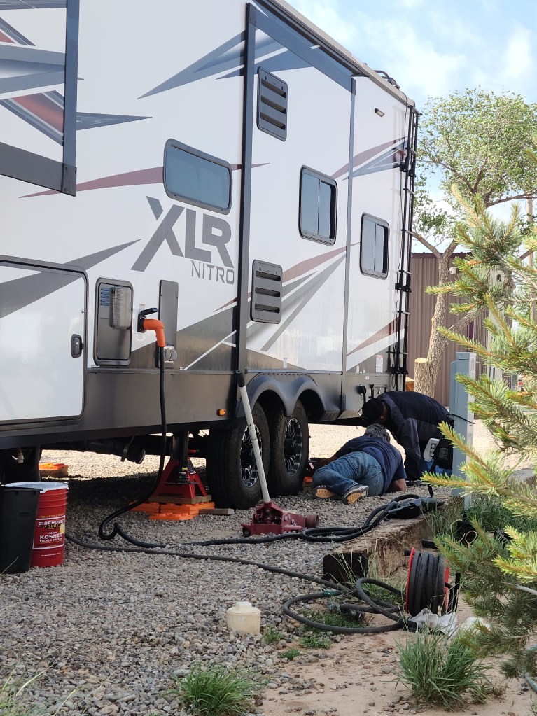 The part arrived Tuesday and the work was planned for the cooler part of the day Wednesday morning. With some help from Jose, the tow service guy equipped with a pneumatic jack (because you really can’t lift an RV with a bottle jack), Vic got us back on the road Thursday.